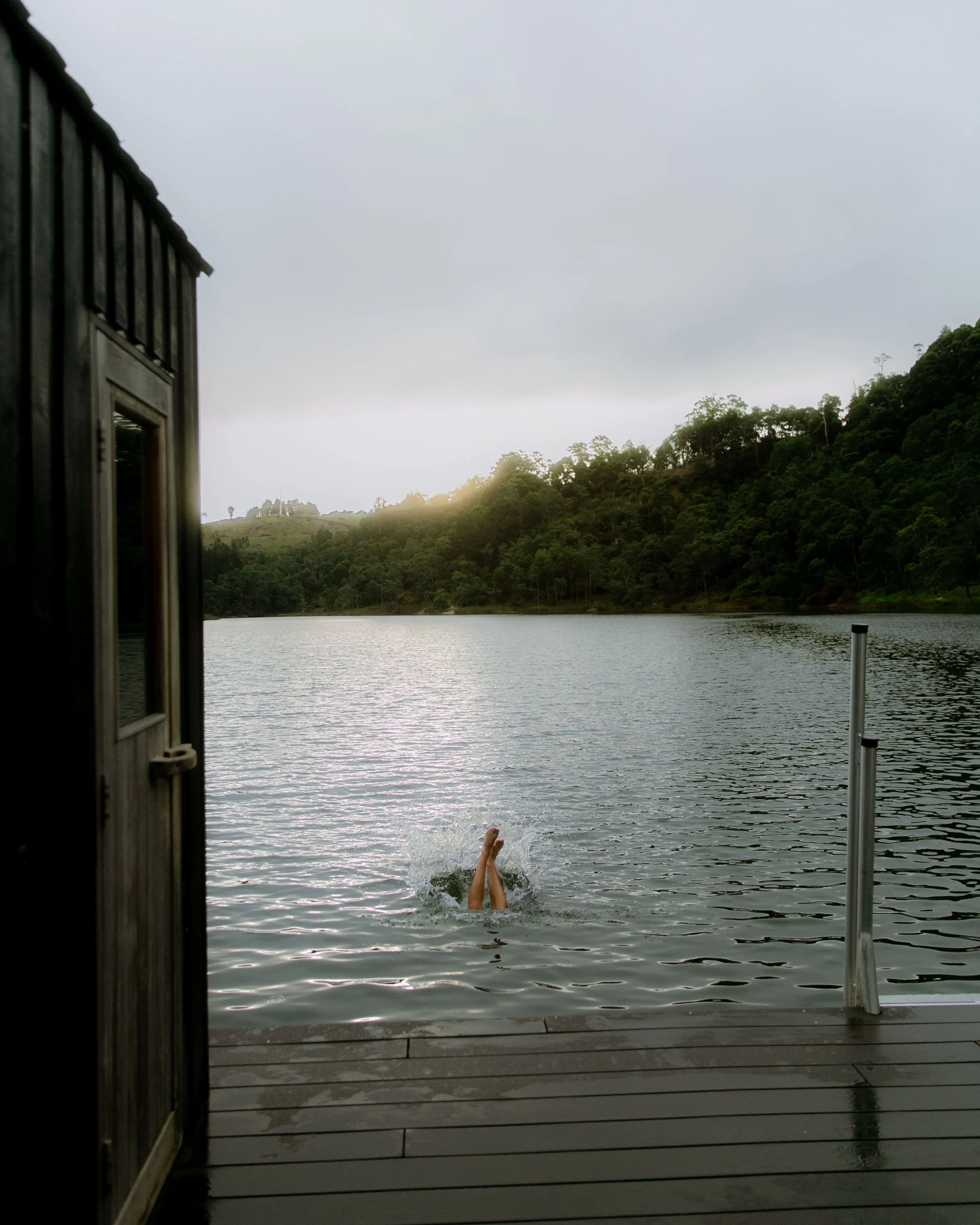 I can’t remember the exact kilometers we drove on this trip, I don’t want to say it was due to poor planning, but more so the go-with-the-flow nature of it all. The weather was looking overcast with potential rain and we took this as an opportunity to have a spa day - Tasmanian style. We hit the road again heading back towards Cradle Mountain to a small town called Derby. Located in Derby is an old mine that has now become a lake. Here you can find the most wonderful Scandinavian style sauna floating on the edge of the water. We managed to squeeze into the last booking of the day and had the whole sauna to ourselves. We pushed our bodies to our limits sitting in the 100 degree heat, before cooling off and cold plunging into the 16 degree lake. We did this on repeat, each time pushing ourselves to stay longer and become more comfortable in the discomfort of both the heat and the cold water. I highly recommend adding The floating Sauna of Lake Derby to your Tasmania itinerary!